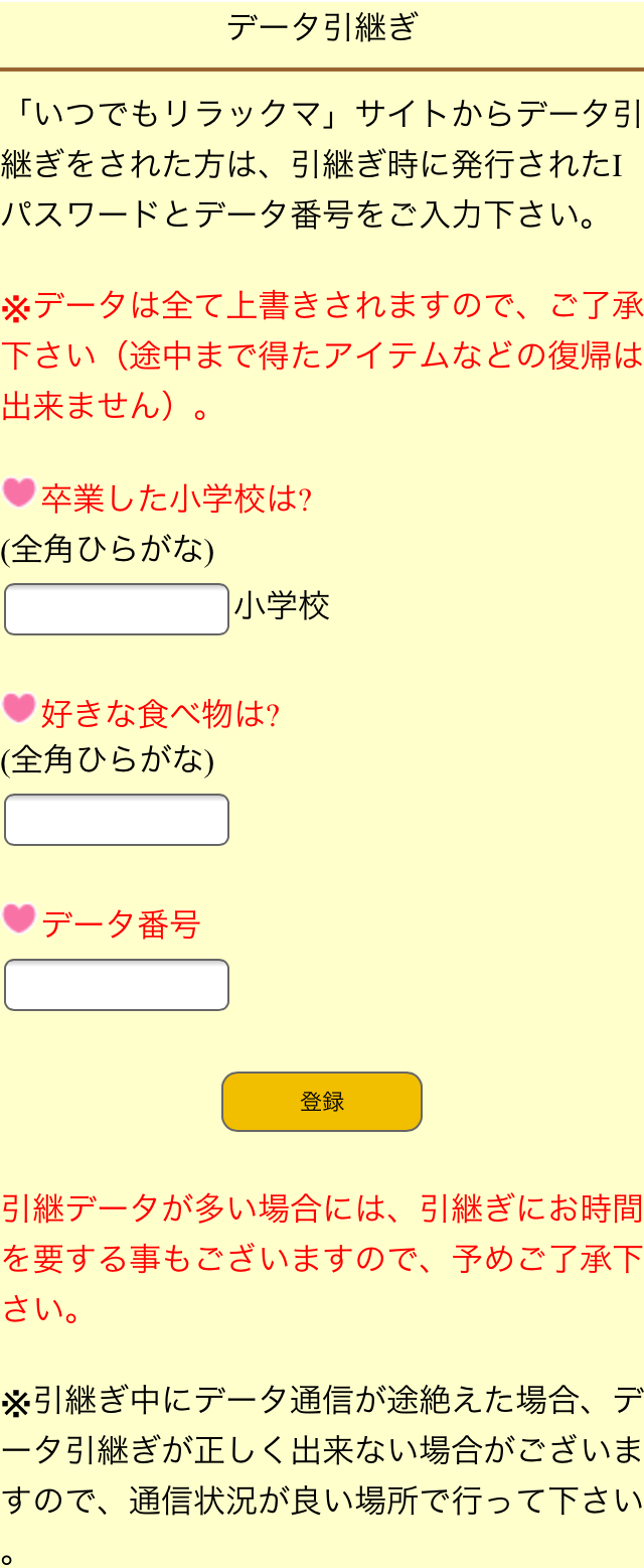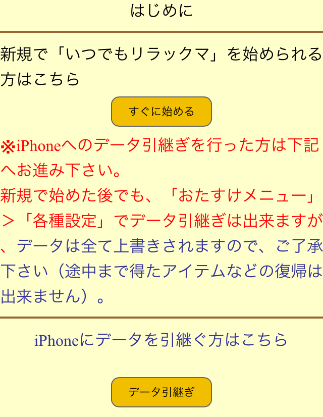 ケータイサイト「いつでもリラックマ」からiPhoneサイト「いつでもリラックマ」へのデータ引継ぎ方法を下記に記載します。